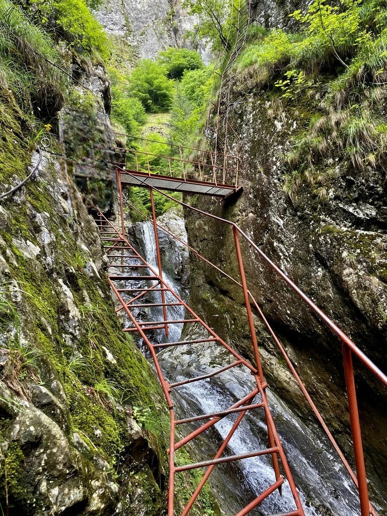 După ce trecem de podeț, unde cu siguranță vom sta câteva minute să admirăm priveliștea și spectacolul inclus în efortul de ajunge până aici, urcăm o scară verticală de vreo 10 metri după care traseul continuă în coastă pe cealaltă parte a văii.