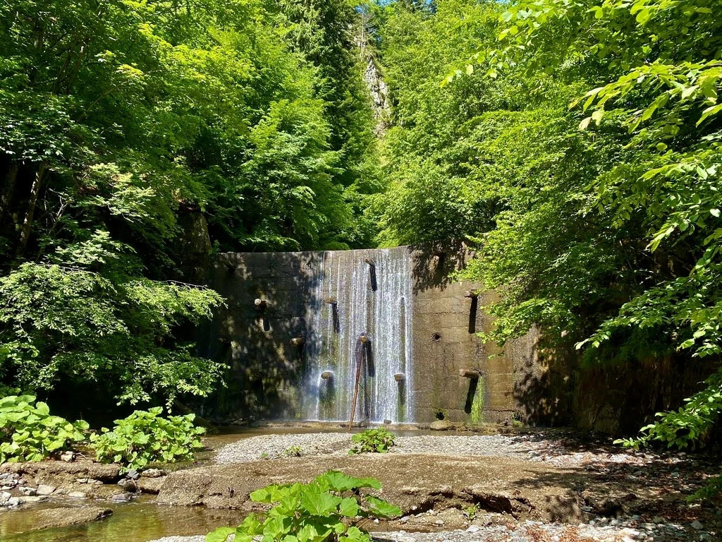Traseul începe cu un baraj artificial de aluviuni, pe care îl escaladăm pe partea stângă, pe o scară metalică.